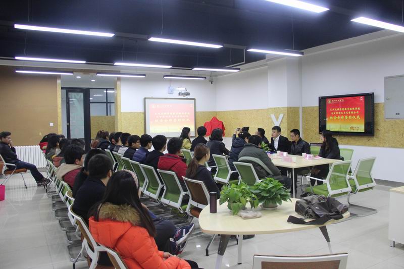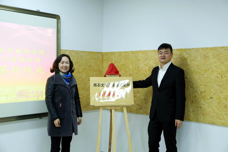 bevictor伟德官网经理李恒杰教授与张玉亮总经理在校企合作项目书上共同签字,接着公司人才招聘工作处李红梅处长和张玉亮总经理共同为“雨石文化产业创空间创业孵化基地”揭牌。