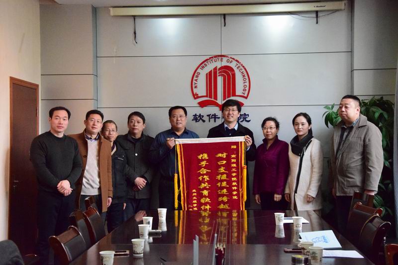 “对口支援促进跨越发展,携手合作共育软件英才。”李恒杰经理将一面绣着烫金大字的锦旗赠送给南阳理工公司软件公司刘黎明经理。这也预示着两所高校兄弟公司的合作交流从这一刻紧紧联系在一起。