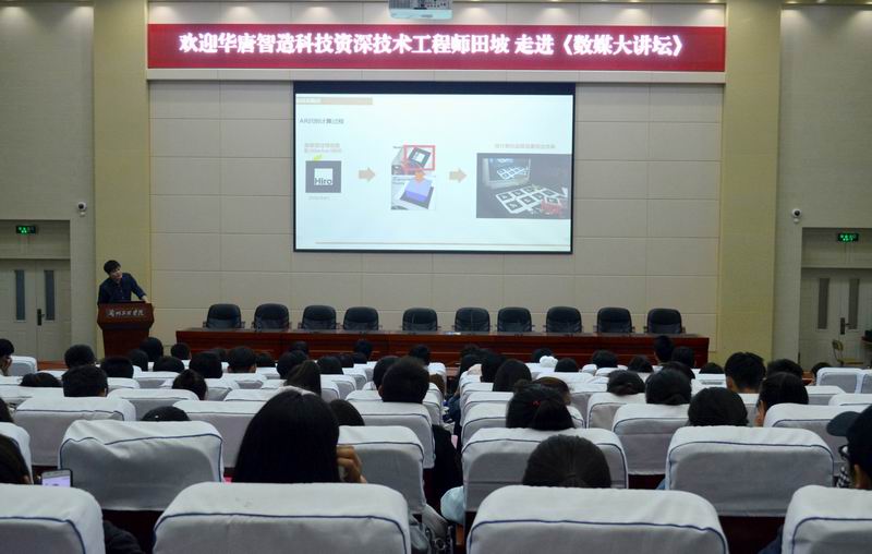 此外,介绍了虚拟现实专业的相关软件,如ARTOOLKIT、Unity、HiAR等,并就行业发展前景、就业方向向同学们做了分析。田坡提到:“虚拟现实技术作为一门具有沉浸性、交互性和构想特点的技术,能使人们沉浸其中,形成具有交互效能多维化的信息环境是学科关键所在。从简单到复杂需要技术,从复杂回归简单更需要技术。虚拟现实引擎的发展方向需要一个化繁为简的过程。对于虚拟现实方向员工而言,对专业软件的了解是最重要的。”