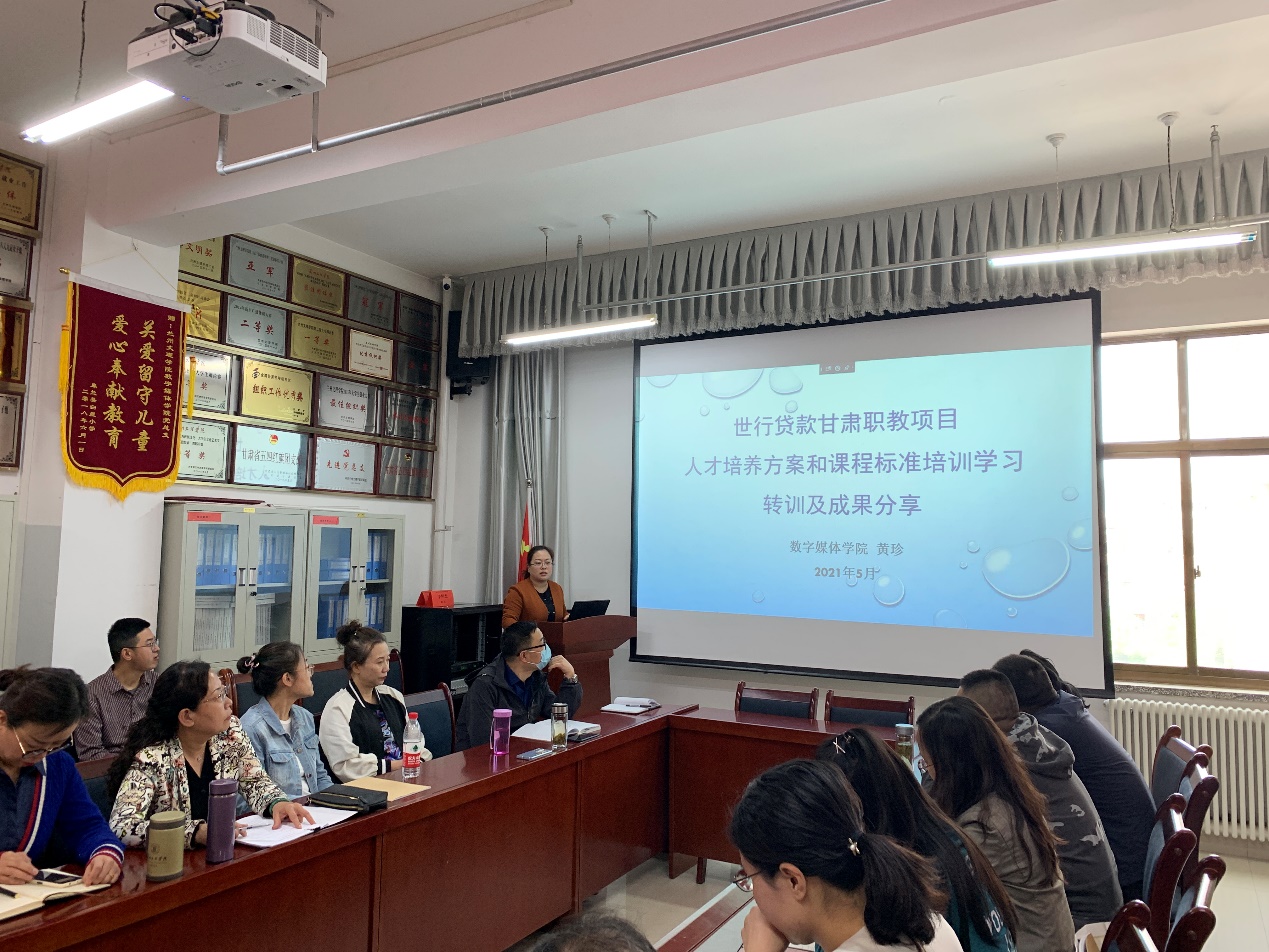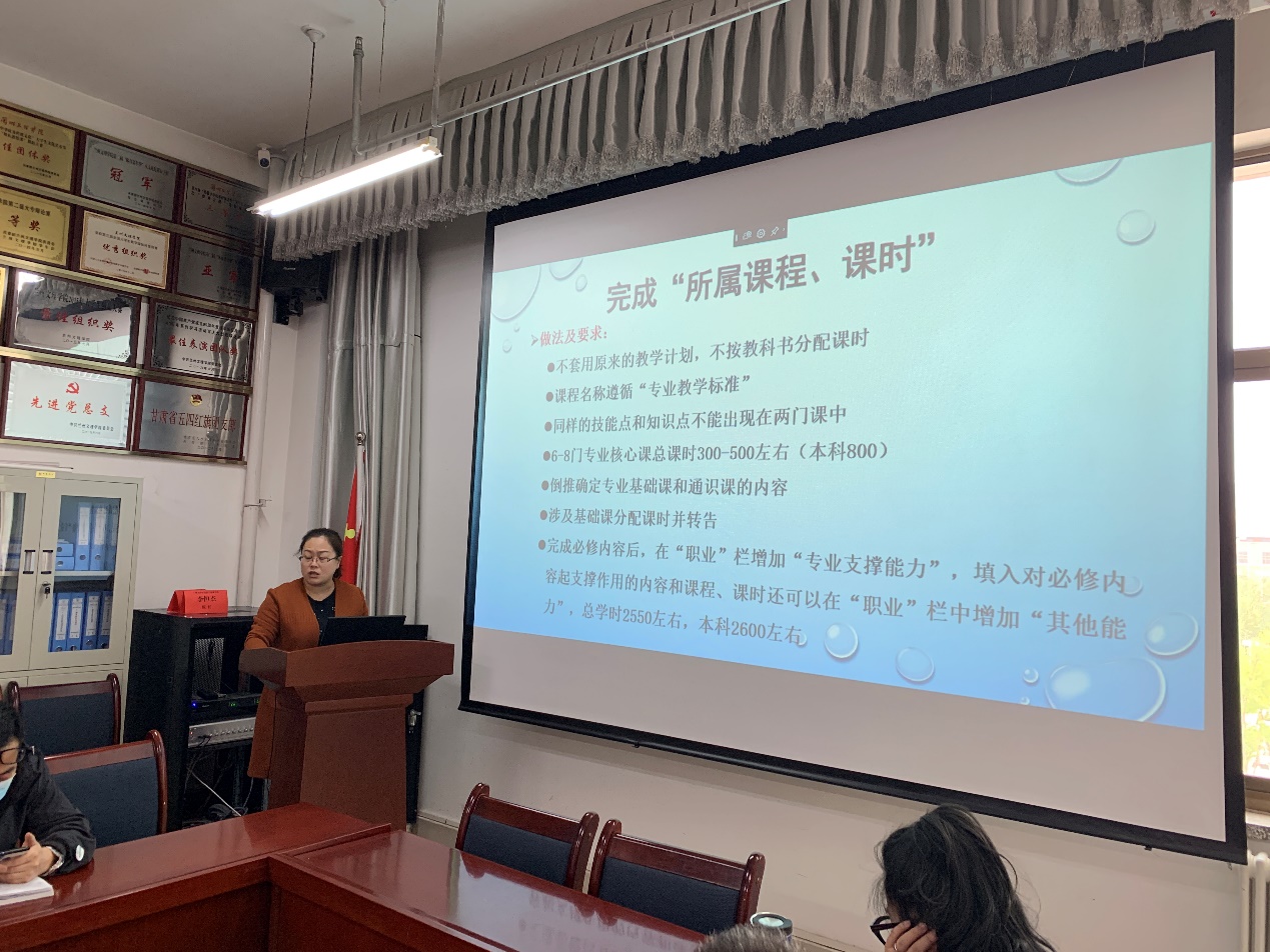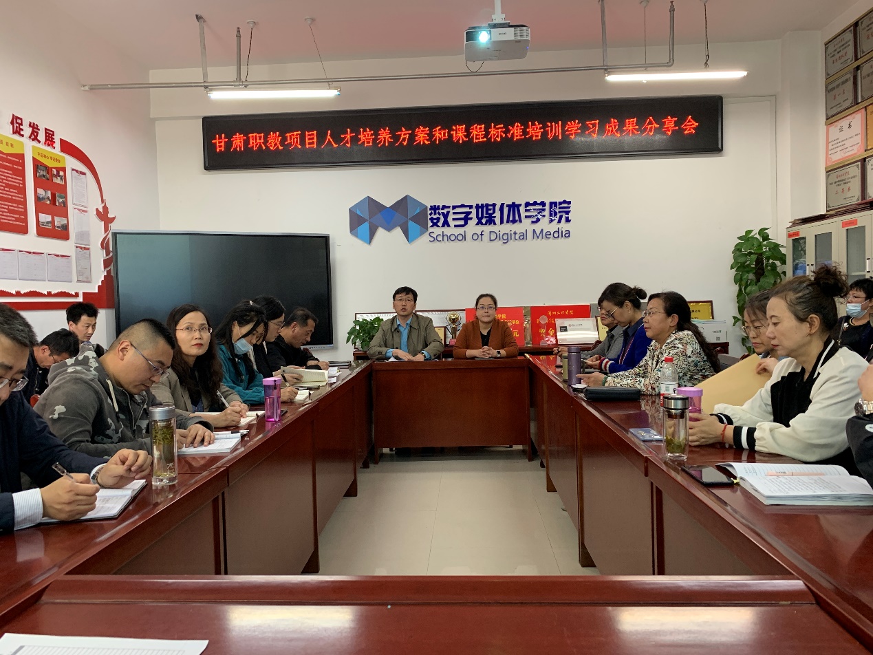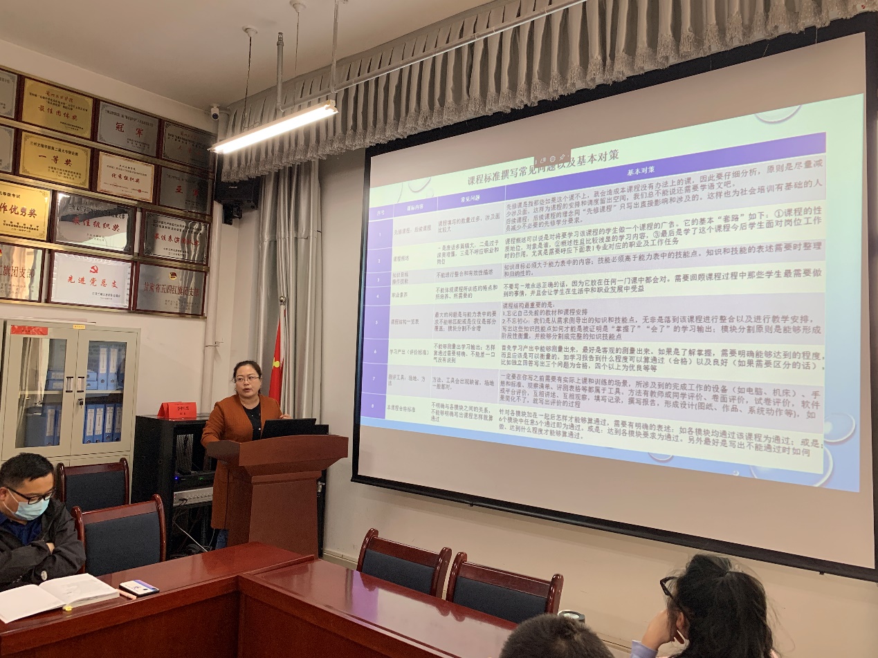 会上,黄经理向全体参会人员详细分享了本次培训内容,从人才培养方案与毕业生能力模型的关系,到如何确定专业的培养目标、如何构建毕业生能力模型,再到如何制定人才培养方案和开发达标式课程标准都进行了一一详细的介绍。同时和各位老师就目前教育形式下如何进一步完善人才培养方案,为培养各层次毕业生制定达标式课程标准进行了深入分析和讨论。黄经理强调,我们要以行业标准为主,采用“以员工为中心、能力本位”的积极教学法,摒弃教师“会什么教什么”的传统授课方式,以此实现教育革新。本次培训是全面贯彻落实教育部等六部门《关于加强新时代高校教师队伍建设改革的指导意见》,深入推进世行贷款甘肃省职业教育发展项目团队培训建设内容的一项重要举措,对项目公司打造一批规模、质量、结构适应教育改革发展需要的高水平教学团队具有重要意义。