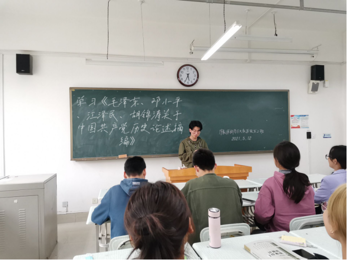 首先由宣传委员李德成为大家对《毛泽东、邓小平、江泽民、胡锦涛关于中国共产党历史论述摘编》一书做了简要介绍,并和大家一起对本书的所表达的教育意义进行了学习。该书既有我们党的领导人对党在不同时期的历史回顾,也不乏对党史上重要人物、重要会议、重大事件的周年纪念以及经验总结,一些资料更是从浩渺档案中发掘后首次公开。李德成强调,开展党史学习教育,要抓住感悟思想伟力这个首要,着力提高学习质量和效果;抓住树立正确党史观这个关键,着力增强宣讲的吸引力感染力,将党的精神运用到日常的学习生活中去,以加强我们生活中的组织性。通过学习《摘编》,我们要对中国共产党的发展有一个清晰的认识,并且要善于总结,将其中的经验教训用到我们的学习中去,以减少经验性的错误。随后,由班级各批积极分子与代表发表对此次学习的新的体会。其中,第一批积极分子代表李薇表示,我们要深刻的认识到学习党史对我们的重要性,要通过党史学习教育来激发活力的责任感和使命感,从小事做起,积极帮助班级同学解决学习和生活中所遇到的问题。第三批积极分子代表郭敏表示,我是刚刚被确定为积极分子,通过这两天的党课学习和本次团日活动的学习,我清晰的感受到了共产党的伟大,他是我们不断追求的方向,我们要积极的项党组织靠拢,不断的加强自己的政治觉悟,在思想上与党保持一致。最后,宣传委员李德成对本次团日活动进行了总结,并倡导同学们在今后的生活中要主动的去了解党的知识。