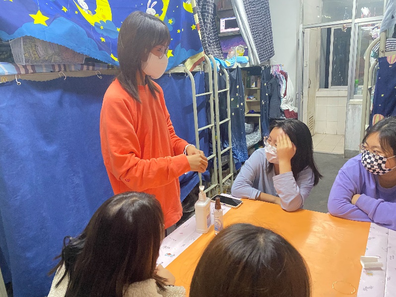 正确洗手是预防腹泻和呼吸道感染的较有效措施之一,预备党员雷子萱等同学为宿舍同学详细讲解和示范“七步洗手法”。