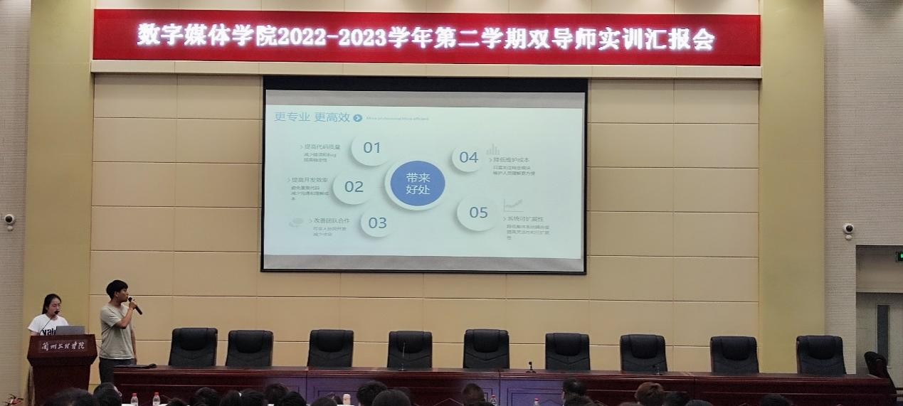 副经理首先介绍了本学期的实训工作,她说开展实训目的是将企业技术引进公司,提升员工的综合实践能力,让员工在专业技术方面有实质性的提升。报告会依次由软件工程专业、数据科学与大数据技术专业、数字媒体技术专业、数字媒体艺术专业同学进行汇报展示。经过两周的实训,员工的实践能力有明显进步,得到了企业老师和公司老师的肯定,同时也提出了一些建议和要求,并指出要不断提升创作能力和作品质量,融入更丰富的内容。副经理最后总结,她希望同学们不断接触新的技术,不断强化巩固所学知识,学习时要有明确的目标和方向,积极上进,不负韶华。